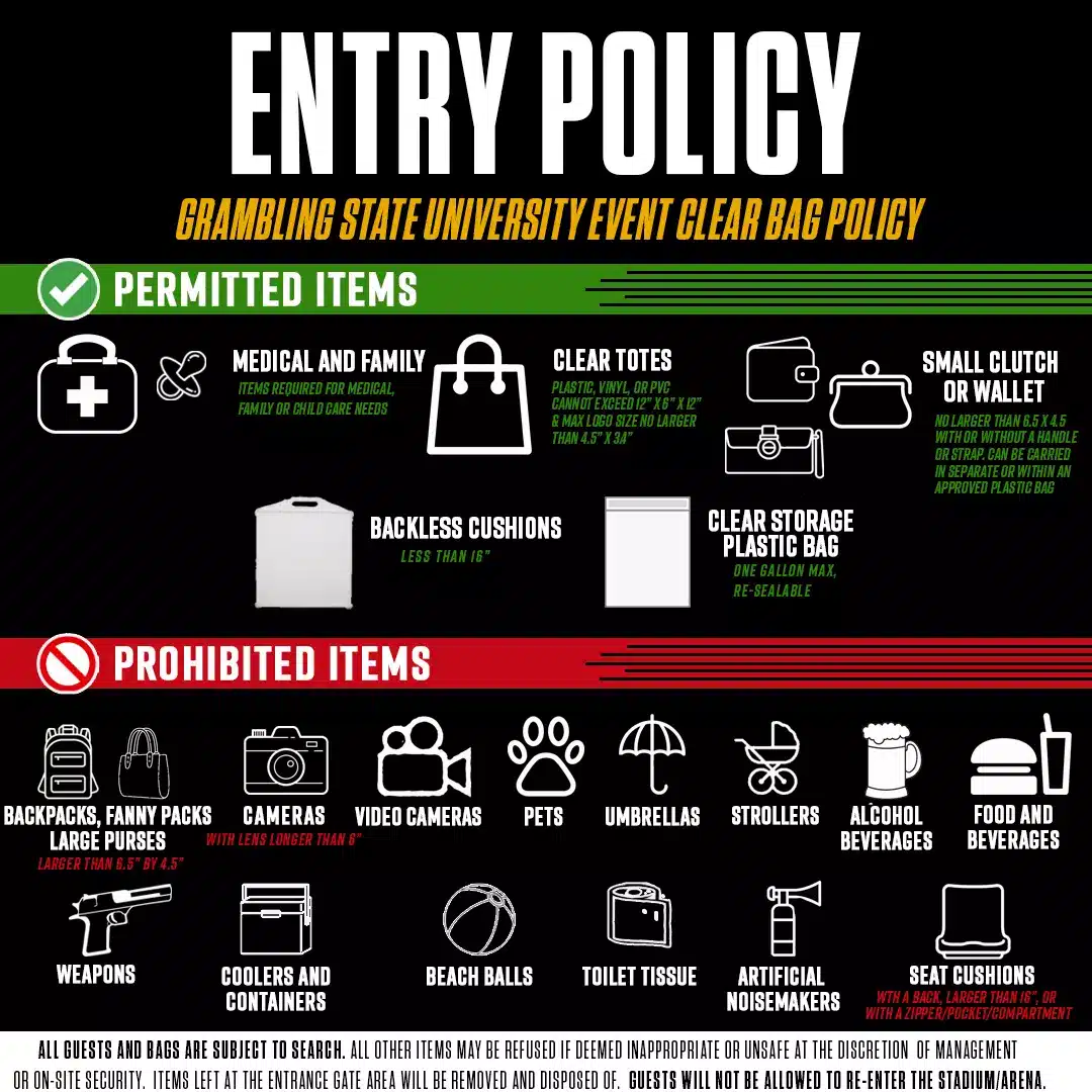 Please note that Grambling State University has implemented a Clear Bag Policy for all home events. Fans are encouraged to carry items in clear plastic bags or small clutches (no larger than 4.5″ x 6.5″). All bags and personal items are subject to search upon entry.